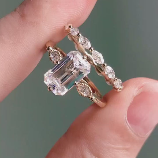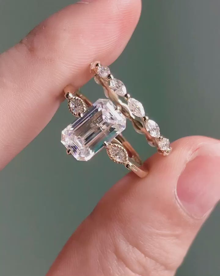 3 CT Emerald Cut Moissanite Diamond Ring Set Emerald Diamond Engagement Rings Wedding Sets 14K Gold Ring Sets Anniversary Rings Promise Ring